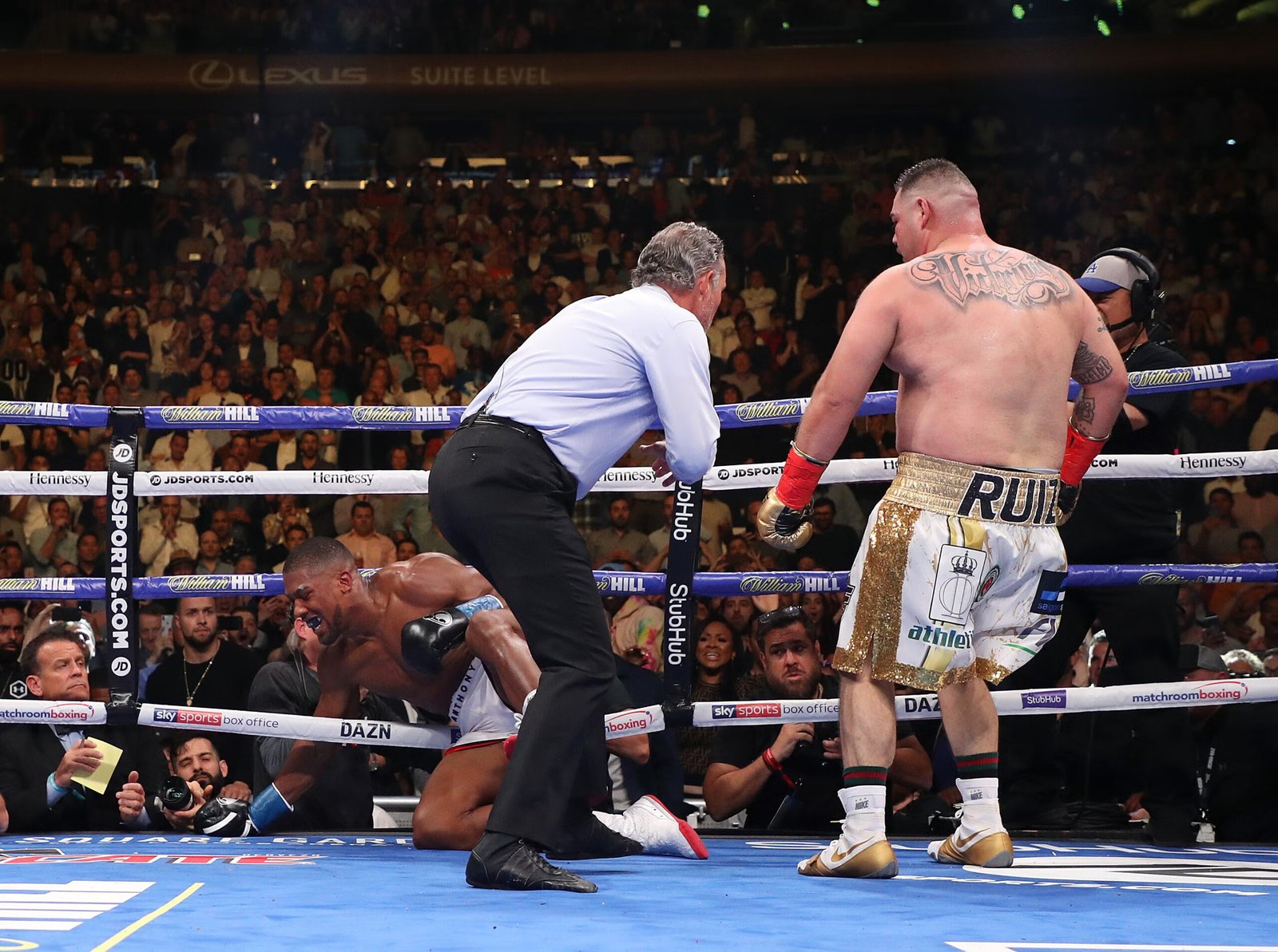 Después de una finta al cuerpo, Joshua tomó a Dubois desprevenido con un derechazo cruzado de pistón, enviando al joven saltando hacia las cuerdas en retirada. Allí, Joshua conectó dos derechazos más, pero Dubois las tomó bien, incluso conectando un contraataque justo después del segundo tiro. Joshua intentó combinarlo con un gancho como su tercer ataque, pero fue un golpe desde atrás lanzado desnudamente, desde demasiado lejos y con la mano izquierda de AJ demasiado baja para protegerlo. Esta vez, la mano derecha de Dubois no aterrizó después de la de Joshua sino antes. Joshua se desplomó sobre la lona y, a pesar de sus admirables esfuerzos por levantarse una vez más, este castigo en particular resultó demasiado.