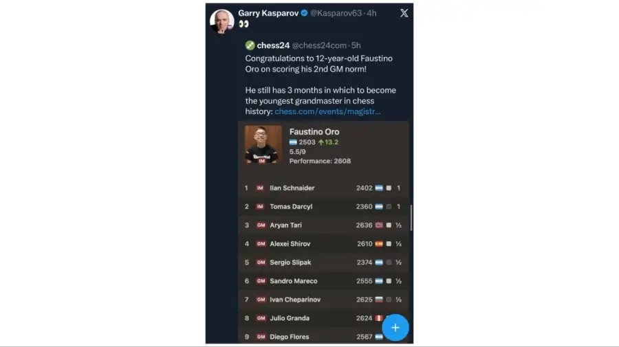 En la publicación mencionada, se destaca que el argentino superó los 2.600 puntos de rendimiento en un torneo, por segunda vez en su carrera. De alcanzarlo por tercera vez dentro de los próximos tres meses, Oro podría convertirse en el Gran Maestro más joven de la historia.