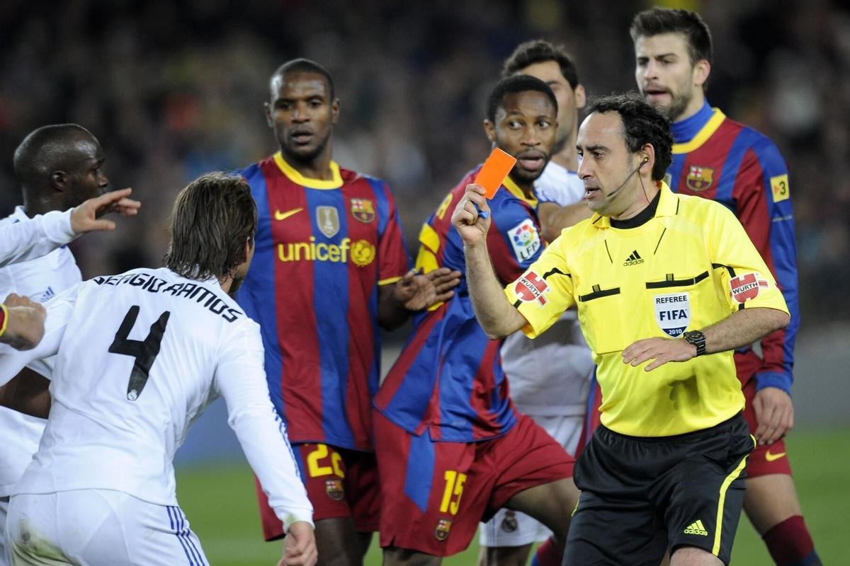 Iturralde González expulsa a Ramos en el clásico del 5 -0 (2010 por una patada a Messi. / Paco Largo