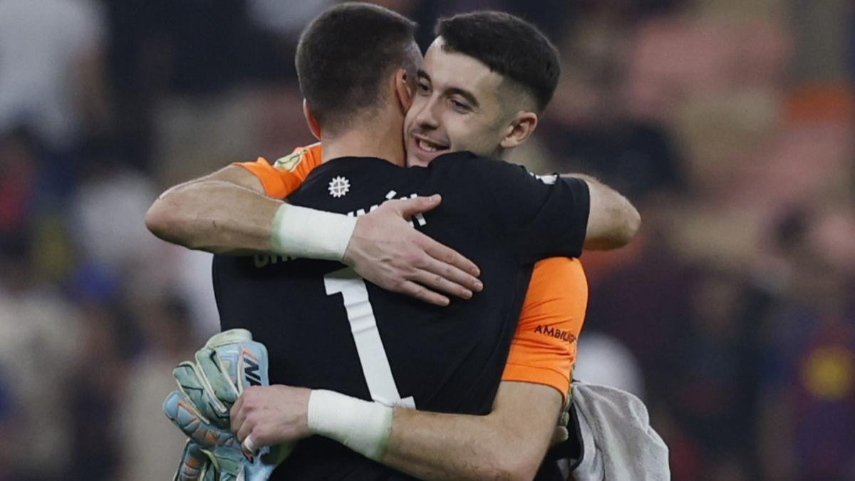 Joan Garcia y Unai Simón se abrazan tras el partido. / ·