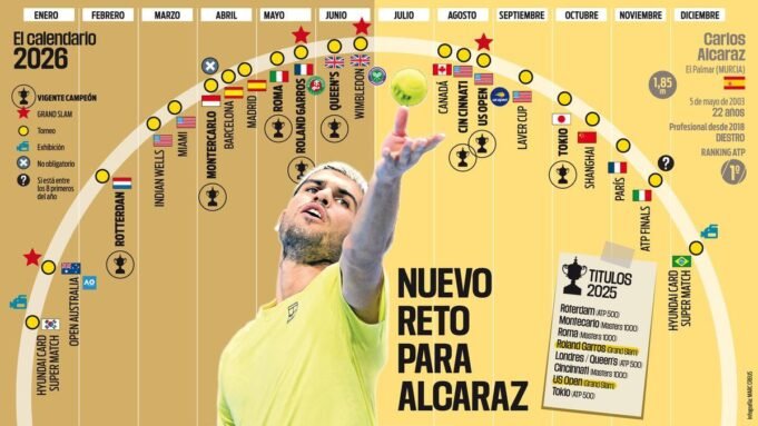 Carlos Alcaraz fue uno de los grandes nombres del deporte mundial en 2025 en el año de su consolidación. El tenista murciano cuajó un año brillante, con ocho títulos, dos de gran slamy recuperando el número uno mundial. Pero en el tenis, lo bueno hecho se convierte siempre en una obligación para después. Y en ello se encuentra Carlitos en este 2026.