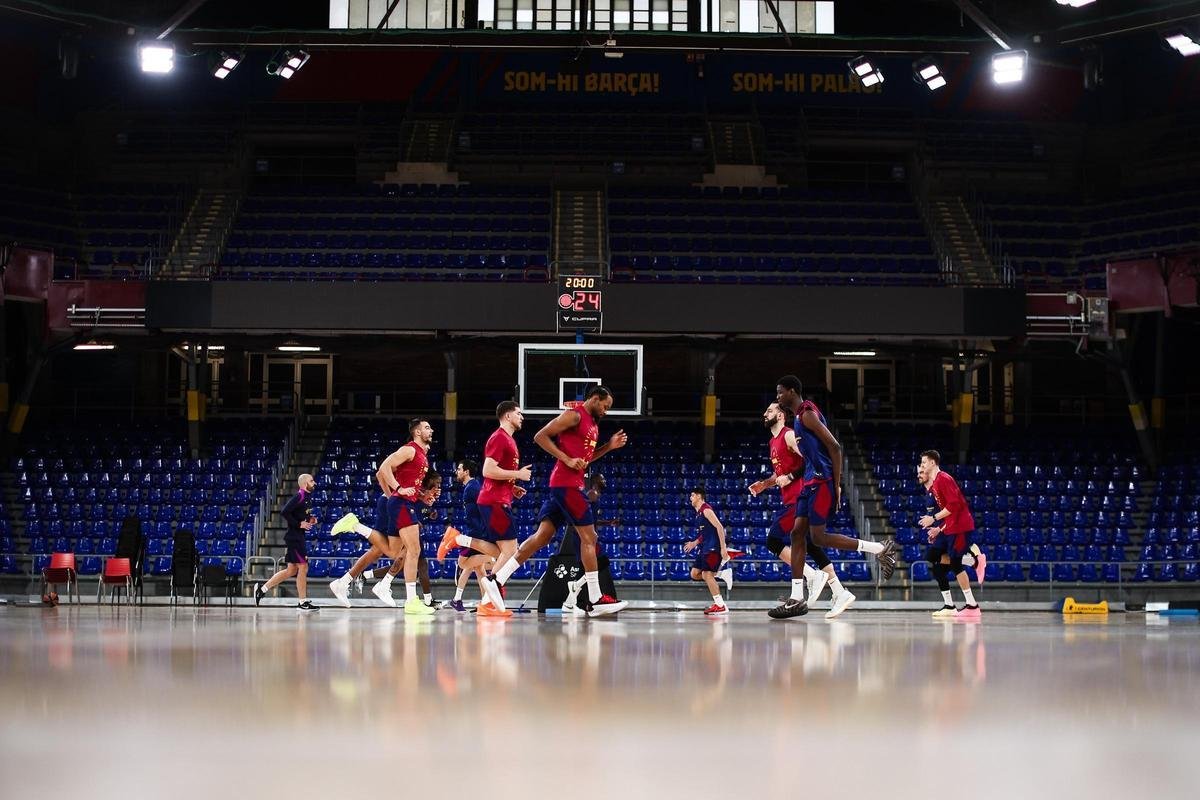 Kevin Punter, en primer plano, trabaja con el equipo en la previa del duelo ante el Dubai Basketball / FCB