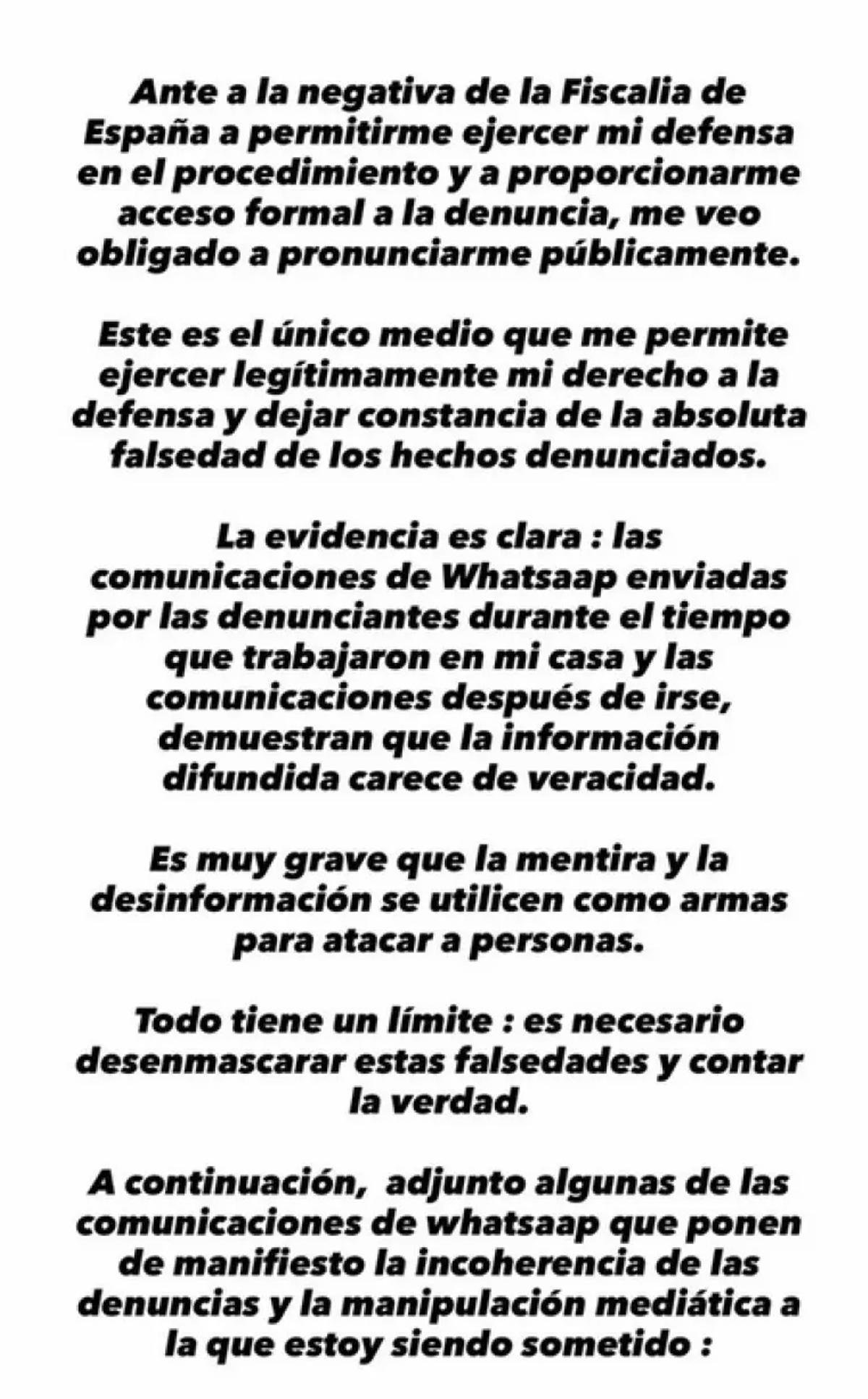 En un comunicado, el artista explica que “Ante la negativa de la Fiscalía de España a permitirme ejercer mi defensa en el procedimiento y proporcionarme acceso formal a la denuncia, me veo obligado a pronunciarme públicamente“.