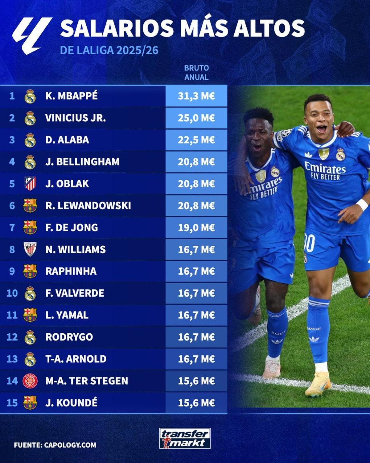 El portal especializado en el mercado de fichajes ‘Transfermarkt’ ha publicado un position en el que aparecen los ´ futbolistas con los salarios más altos de LaLiga española y a tenor de las cifras queda patente que nadie paga a sus estrellas como Florentino Pérez. Siete integrantes de la plantilla de Álvaro Arbeloa están en el ‘Top 15 y cuatro de ellos lideran la lista. En la misma aparecen tres jugadores del Barça -cuatro, si se tiene en cuenta a Marc-André Ter Stegen, ahora cedido al Girona.
