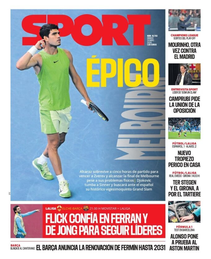 Carlos Alcaraz y Novak Djokovic. Un joven y un veterano. Ambos serán protagonistas de la final del Open de Australia después de protagonizar sendas victorias épicas en unas semifinales inolvidables ante Sasha Zverev y Jannik Sinner, respectivamente. Como no podía ser de otra manera, esta gesta copa la portada de SPORT de este sábado. Fueron dos partidos que tardarán mucho tiempo en olvidarse y que auguran una final también épica mañana domingo.