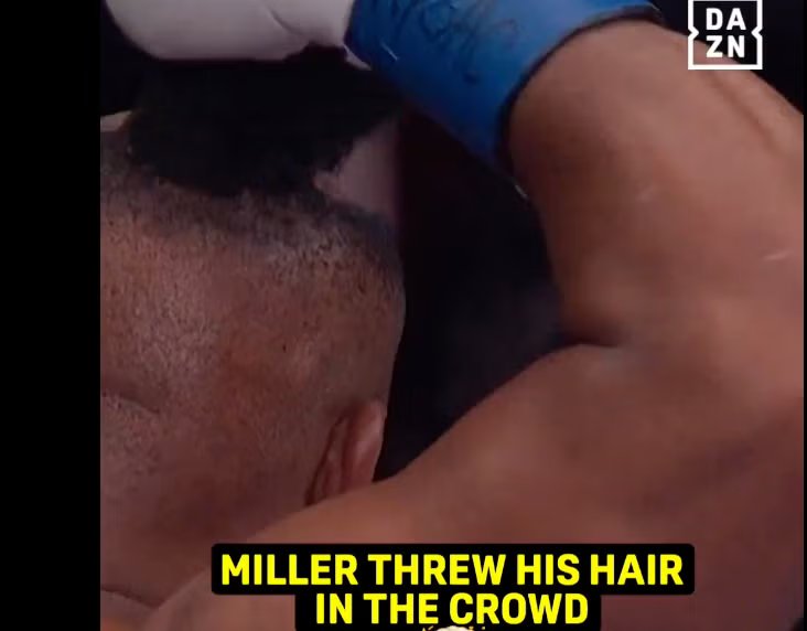Miller estaba peleando converse Kingsley Ibeh cuando este último derribó el peluquín de “Big Infant” en el segundo asalto, con el postizo despegándose del frente y cayendo hacia atrás, apenas sujeto a la parte back de la cabeza de Miller.