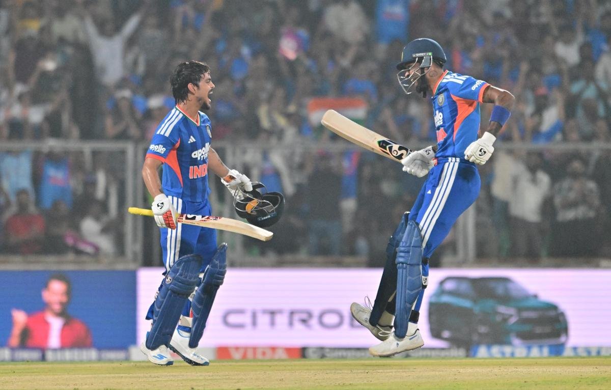 Ishan Kishan de India celebra con Hardik Pandya después de anotar un siglo en Thiruvananthapuram. | Crédito de la foto: NIRMAL HARINDRAN