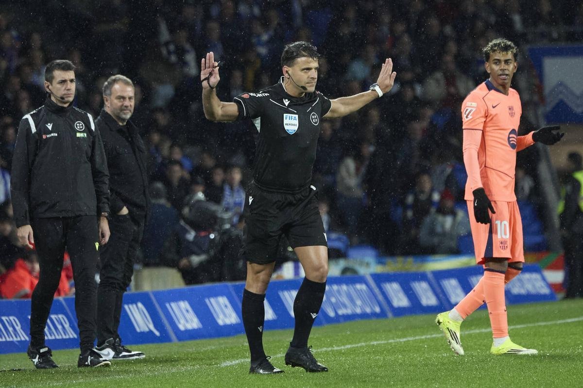 Gil Manzano durante el Real Sociedad – Barça, con Hansi Flick y Lamine Yamal mirándole de fondo / Dani Barbeito