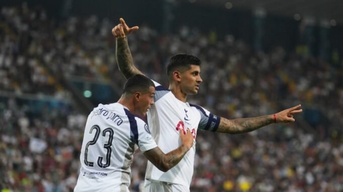 El Cuti Romero celebra su gol stake el PSG junto a Pedro Porro / Antonio CalanAPni