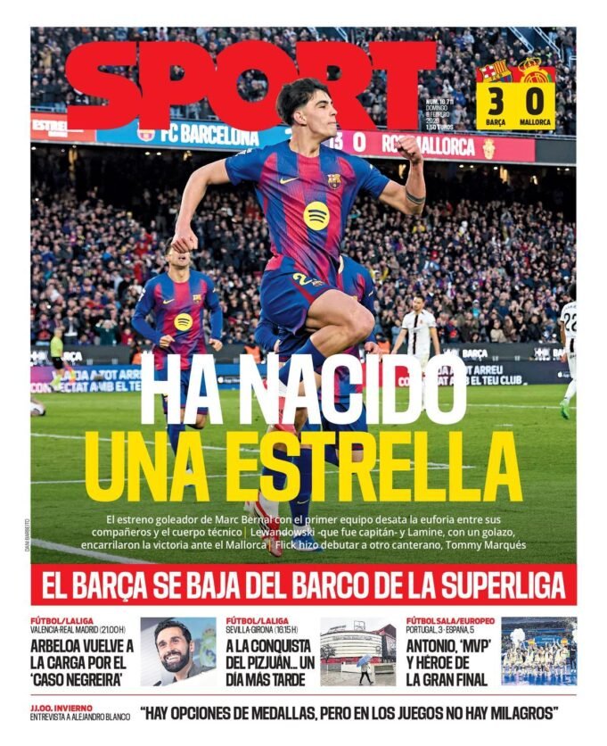 El Barça volvió a ganar en LaLiga EA Sports, en la vista del Mallorca al Spotify Camp Nou. Y uno de los nombres propios del partido fue el de Marc Bernal, protagonista de la portada de SPORT de este domingo. El canterano marcó un golazo para cerrar el triunfo de los de Hansi Flick que supone su estreno realizador con el primer equipo. Lewandowski y Lamine Yamal marcaron los otros dos tantos en un choque en el que debutó otro canterano, Tommy Marqués.