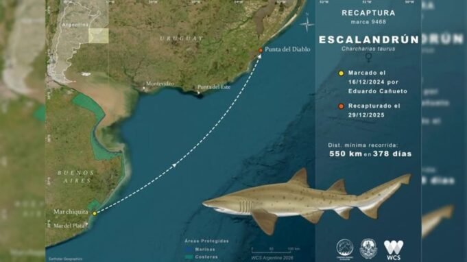 A fines de 2025y gracias al trabajo conjunto con la Dirección Nacional de Recursos Acuáticos (DINARA) de Uruguay, se logró el reporte de la recaptura de esta misma hembra frente a las costas de Punta del Diablodonde fue interceptada por la pesquería artesanal dirigida a la especie. Este registro constituye una prueba contundente de que, en el Atlántico Sudoccidental (ASO)hay una única población de tiburón escalandrúnun dato de enorme relevancia para la gestión y conservación del recurso. No es un detalle menor: desde 2024la especie se encuentra incluida en los Apéndices I y II de la Convención sobre la Conservación de las Especies Migratorias de Animales Silvestres (CMS).