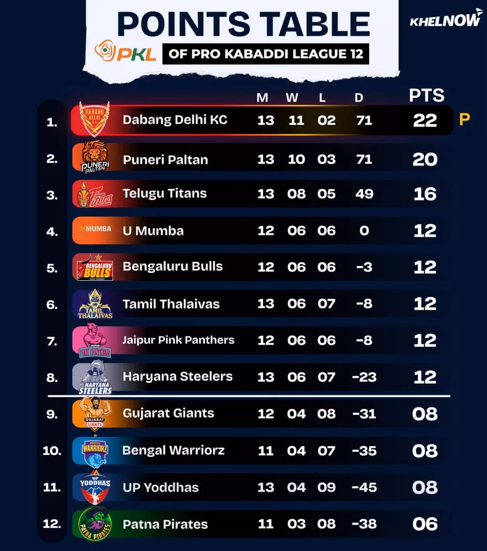 Después de los partidos del 9 de octubre en el PKL 12, el equipo de Dabang Delhi se mantiene en la primera posición a pesar de la segunda derrota y también se ha clasificado para los playoffs. El equipo Bengal Warriors ha alcanzado la décima posición con su cuarta victoria. El equipo Gujarat Giants ha pasado a la novena posición con su cuarta victoria. El equipo UP Yoddha ha caído ahora a la undécima posición con su novena derrota.