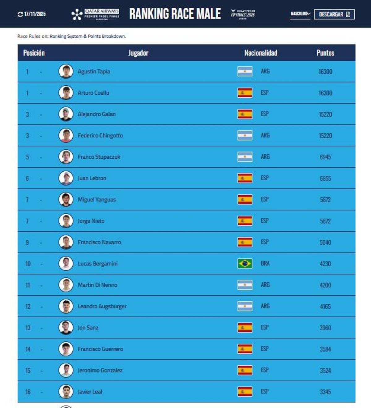 La última actualización del clasificación FIP ha reducido la distancia entre las parejas número uno Arturo Coello y Agustín Tapia en el cuadro masculino con respecto a Chingotto y Galán al defender los uno más puntos. Ha pasado de 7620 a 7140 puntos, sin embargo en la Race, que es más real para decidir el número uno a final de año, la distancia ha crecido y ha pasado de 1360 a 2160, siempre sumando los puntos de ambos jugadores de la pareja.