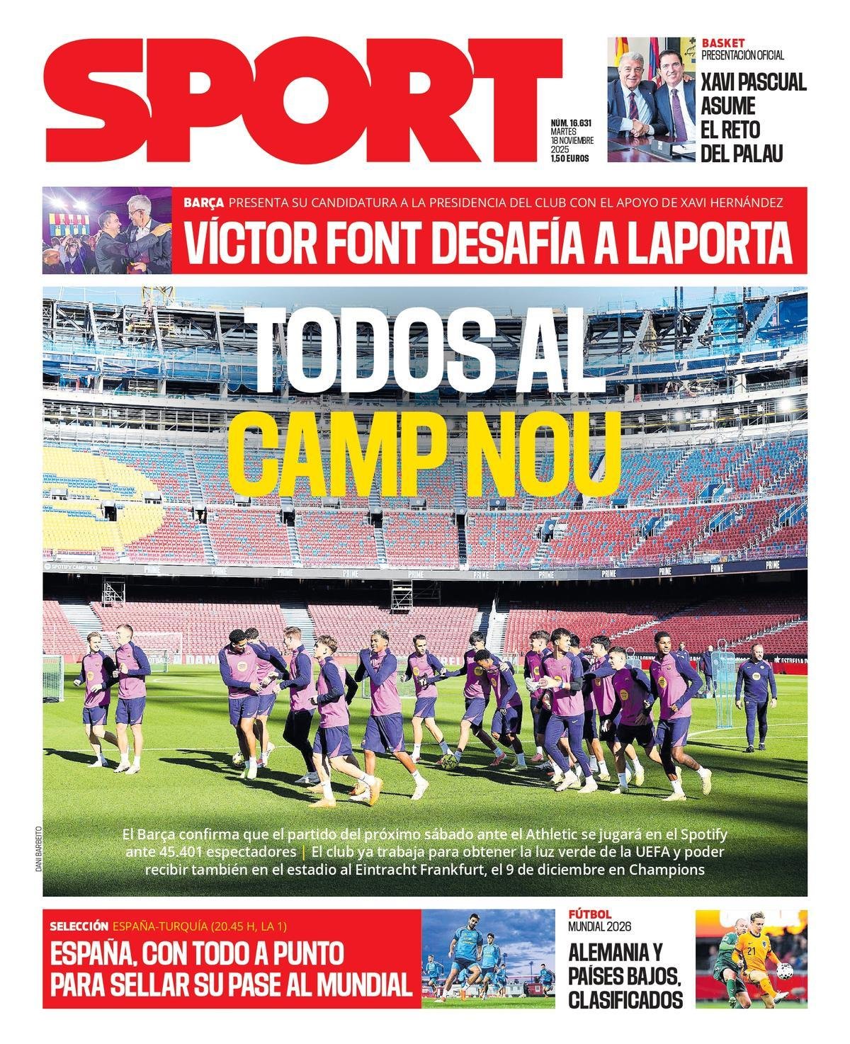 La gran noticia de ayer se conoció a primera hora de la tarde. El Barça comunicó que el partido del próximo sábado opposite el Athletic se disputará en el Spotify Camp Nou. La portada de SPORT de hoy martes recoge esta información, destacando que 45 401 espectadores podrán estar presentes en este choque. El club también trabaja para que los dos próximos partidos en casa de la Champìons League se puedan disputar en el coliseo blaugrana.