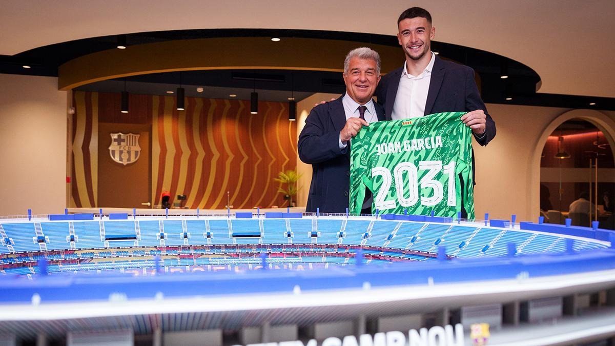 Joan García junto a Joan Laporta tras firmar como nuevo jugador del FC Barcelona / FC BARCELONA