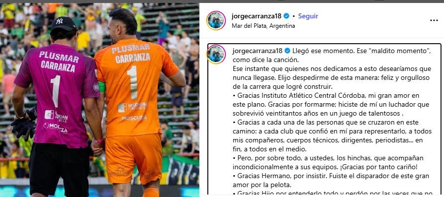 Llegó ese momento. Ese “maldito momento”, como dice la canción. Ese instante que quienes nos dedicamos a esto desearíamos que nunca llegase. Elijo despedirme de esta manera: feliz y orgulloso de la carrera que logré construir. Gracias Instituto Atlético Central Córdoba, mi gran amor en este plano. Gracias por formarme; hiciste de mí un luchador que sobrevivió veintitantos años en un juego de talentosos. Gracias a cada una de las personas que se cruzaron en este camino: a cada club que confió en mí para representarlo, a todos mis compañeros, cuerpos técnicos, dirigentes, periodistas… en fin, a todos en el medio. Pero, por sobre todo, a ustedes, los hinchas, que acompañan incondicionalmente a sus equipos. ¡Gracias por tanto cariño!. Gracias Hermano, por insistir. Fuiste el disparador de este gran amor por la pelota. Gracias Hijo por entenderlo todo y perdón por las veces que no estuve. Gracias a mi Familia y amigos por acompañarme incondicionalmente. Sé que voy a extrañar con locura todo esto. Lo viví con inmensa pasión, lo di todo, y poco puedo reprocharme. Fui inmensamente feliz jugando. Para cerrar: gracias Tiburón Ocuparán un lugar especial en mi corazón. Gracias a todos . Fue un hermoso camino.