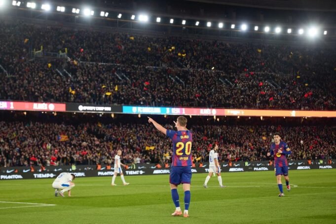 Dani Olmo celebró dos tantos en la victoria del Barça ante el Alavés / DANI BARBEITO