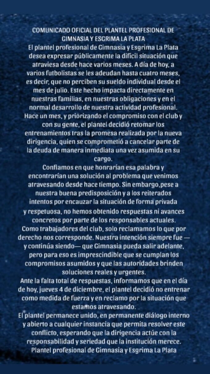“El plantel profesional de Gimnasia y Esgrima La Plata desea expresar públicamente la difícil situación que atraviesa desde hace varios meses. A día de hoy, a varios futbolistas se les adeudan hasta cuatro meses, es decir, que no perciben su sueldo individual desde el mes de julio. Este hecho impacta directamente en nuestras familias, en nuestras obligaciones y en el normal desarrollo de nuestra actividad profesional.