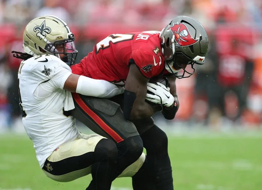NFL: Santos de Nueva Orleans vs Buccaneers de Tampa Bay7 de diciembre de 2025; Tampa, Florida, Estados Unidos; El receptor de Tampa Bay Buccaneers, Chris Godwin Jr. (14), es abordado por la seguridad de los New Orleans Saints, Jordan Howden (31) durante el primer cuarto en el estadio Raymond James. Crédito obligatorio: Nathan Ray Seebeck-Imagn Images