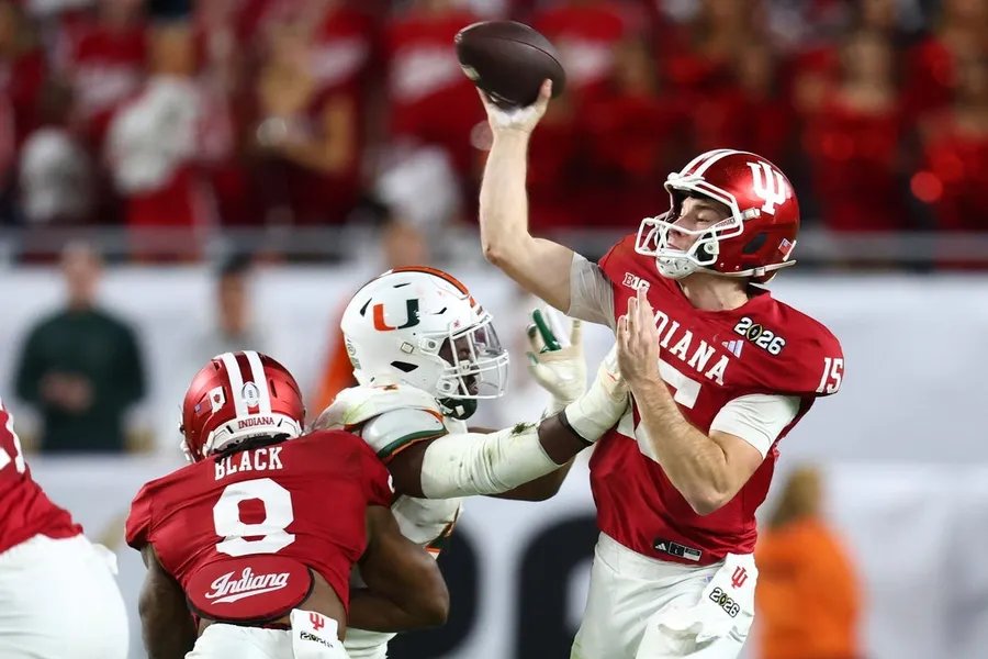 19 de enero de 2026; Jardines de Miami, Florida, Estados Unidos; El mariscal de campo de Indiana Hoosiers, Fernando Mendoza (15), vuelve a pasar contra los Huracanes de Miami en la primera mitad durante el partido del Campeonato Nacional de Fútbol Universitario en el Estadio Hard Rock. Crédito obligatorio: Mark J. Rebilas-Imagn Images