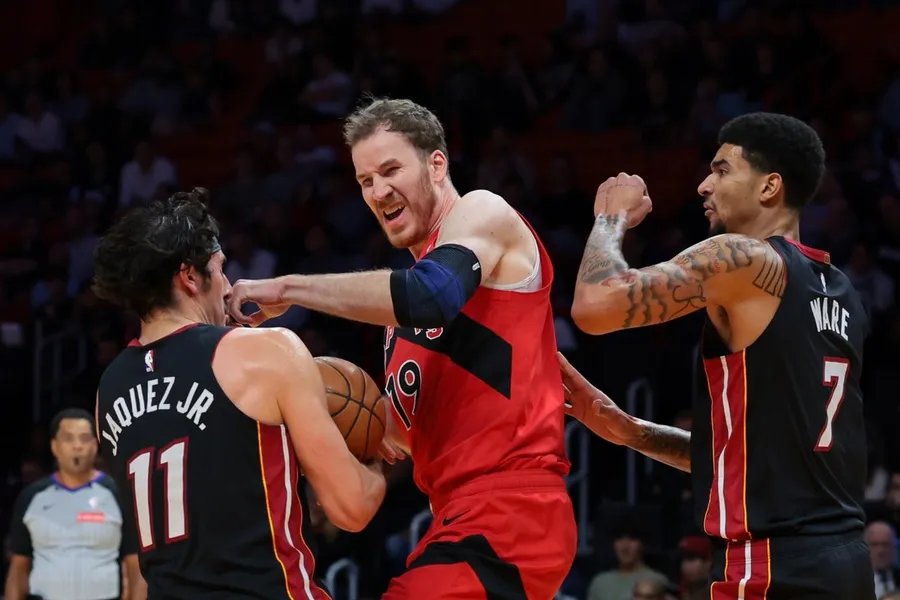 15 de diciembre de 2025; Miami, Florida, Estados Unidos; El delantero de Miami Heat Jaime Jaquez Jr. (11) se rebotó contra el centro de Toronto Raptors Jakob Poeltl (19) durante el segundo cuarto en Kaseya Center. Crédito obligatorio: Sam Navarro-Imagn Images