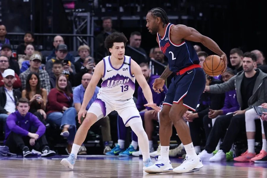 27 de enero de 2026; Salt Lake City, Utah, Estados Unidos; El delantero de LA Clippers Kawhi Leonard (2) dribla el balón mientras el guardia de Jazz de Utah Walter Clayton Jr. (13) defiende durante la primera mitad en Delta Center. Crédito obligatorio: Rob Gray-Imagn Images Kawhi Leonard anotó 21 puntos mientras que James Harden anotó 16 puntos y 10 asistencias para llevar a Los Angeles Clippers a una victoria por 115-103 sobre los Utah Jazz el martes por la noche.
