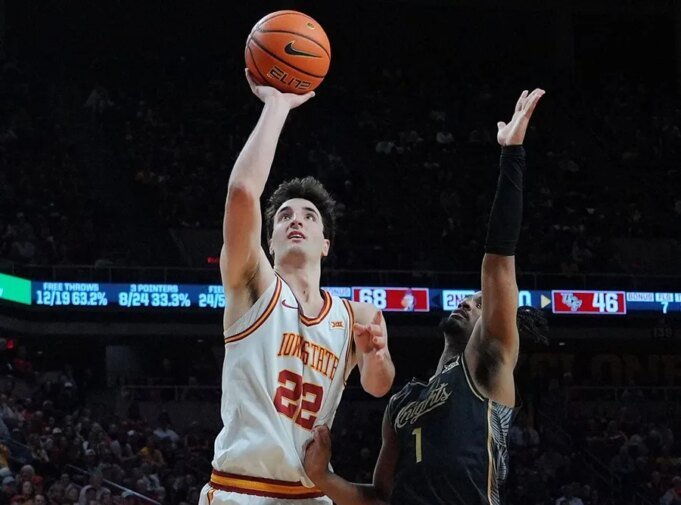 El delantero de los Ciclones del Estado de Iowa, Milan Momcilovic (22), dispara el balón sobre el guardia de los Caballeros de la UCF, Themus Fulks (1), durante la segunda mitad de la conferencia Big-12 de baloncesto masculino el 20 de enero de 2026, en el Hilton Coliseum en Ames, Iowa.