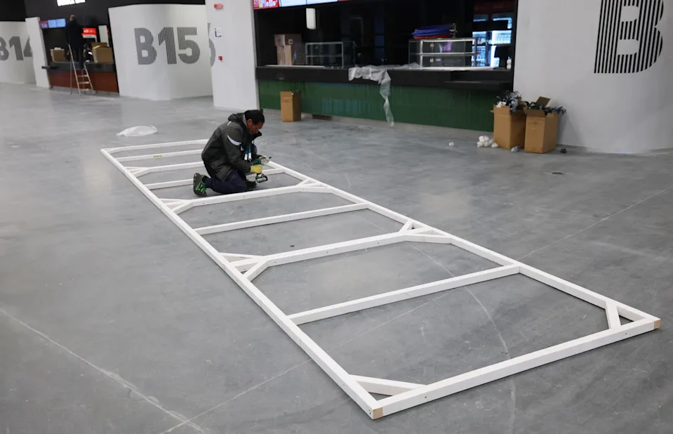 Hombres con chalecos naranjas de construcción estaban ocupados construyendo un puesto de mercancías en una sección de la explanada. Los empleados de la sector con chaquetas Milano Cortina 2026 azul oscuro limpiaron capas de polvo de los postes que pronto se utilizarán para dirigir el flujo de multitudes. En otros lugares, los trabajadores rasparon y masillaron las paredes, abastecieron puestos de comida e instalaron mesas portátiles y carteles. El pitido de los montacargas y el olor a pintura fresca asaltaban constantemente los sentidos.
