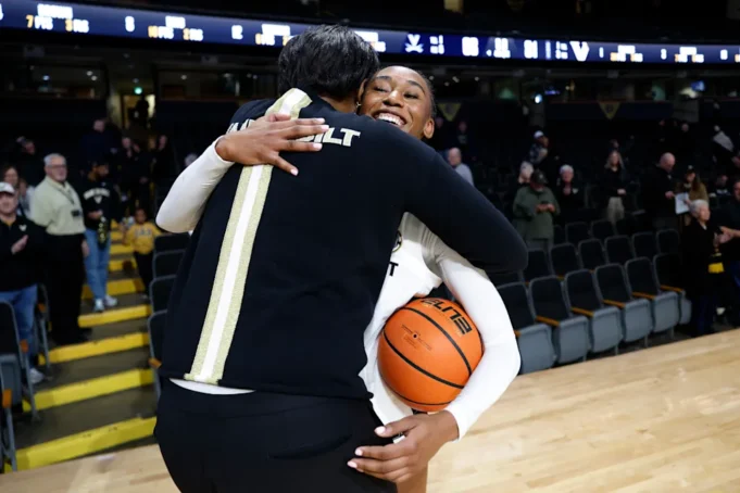 Candice Storey Lee, AD de Vanderbilt, abraza a Mikayla Blakes después de que anotó su punto número 1.000 de la temporada el 3 de diciembre de 2025. (Johnnie Izquierdo/Getty Images)