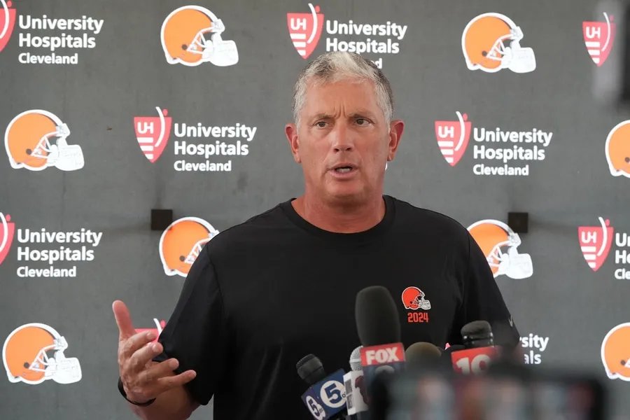 5 de agosto de 2024; El coordinador defensivo de los Cleveland Browns, Jim Schwartz, durante una conferencia de prensa en las instalaciones de entrenamiento de los Browns en Berea, Ohio. Crédito obligatorio: Bob Donnan-Imagn Images