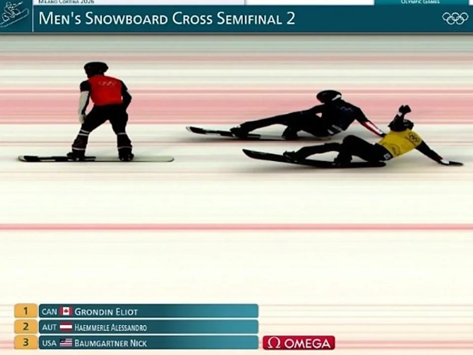 Tercero durante la mayor parte de la carrera, hizo su último y desesperado empujón en los últimos 20 segundos trick el canadiense Eliot Grondin y el austriaco Alessandro Haemmerle en la mira. A medida que se acercaba la línea de meta, Baumgartner se reclinó y levantó la parte delantera de su tabla, con la esperanza de llegar primero al wire.