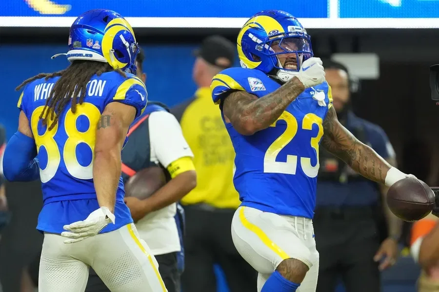 NFL: San Francisco 49ers en Los Ángeles Rams2 de octubre de 2025; Inglewood, California, Estados Unidos; Los Angeles Rams corriendo hacia atrás Kyren Williams (23) reacciona después de correr para un touchdown contra los 49ers de San Francisco durante la primera mitad en el estadio SoFi. Crédito obligatorio: Kirby Lee-Imagn Images