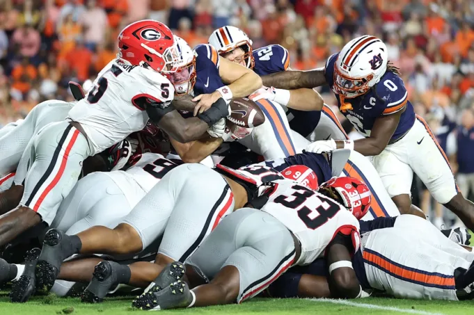 Los Auburn Tigers estaban a menos de una yarda de la zona de anotación, aparentemente a punto de tomar una ventaja de 17-0 sobre los Georgia Bulldogs No. 10 al final de la mitad que los Tigers habían dominado completamente. Y luego, en un abrir y cerrar de ojos, todo desapareció: el posible touchdown de Auburn, las esperanzas de Auburn de una sorpresiva victoria sobre un oponente clasificado, la esperanza de Auburn de una temporada salvable, todo se esfumó en un balón suelto muy discutible en la línea de gol.