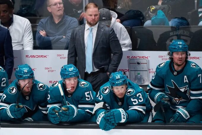 NHL: Vegas Golden Knights contra San Jose Sharks9 de octubre de 2025; San José, California, Estados Unidos; El entrenador principal de San Jose Sharks, Ryan Warsofsky, observa el juego contra los Vegas Golden Knights con el centro Ty Dellandrea (10), el ala derecha Collin Graf (51), el ala izquierda Jeff Skinner (53) y el centro Tyler Toffoli (73) durante el segundo período en el SAP Center en San José. Crédito obligatorio: Robert Edwards-Imagn Images