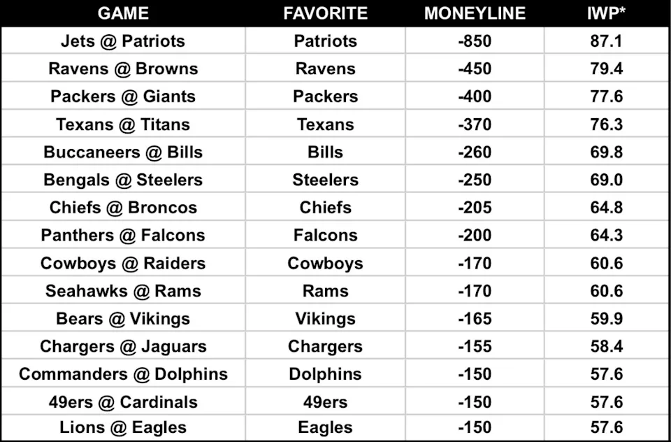Línea de dinero y porcentaje de victorias implícito para los favoritos de la NFL de la Semana 11 (Matt Russell/colaborador de Yahoo Sports)