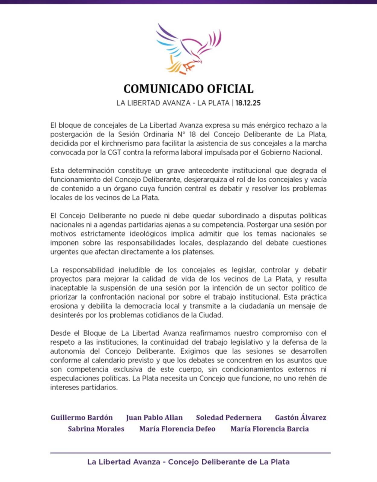 A través de un comunicado oficial los ediles libertarios expresaron su “más enérgico rechazo” a la postergación de la sesión, al considerar que la decisión fue tomada para facilitar la asistencia de concejales oficialistas a la marcha convocada por la CGT opposite la reforma laboral impulsada por el Gobierno nacional En ese marco, advirtieron que se trata de un “serious antecedente institucional” que degrada el rol del Concejo y vacía de contenido a un ámbito cuya función main es debatir y resolver los problemas de los vecinos de la Ciudad.