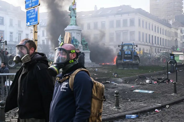 Los agricultores que protestaban, algunos de los cuales viajaron a la capital belga desde lugares tan lejanos como España y Polonia, trajeron patatas y huevos para tirarlos y libraron furiosos intercambios con la policía mientras los manifestantes quemaban neumáticos y un falso ataúd de madera que llevaba la palabra “agricultura”.
