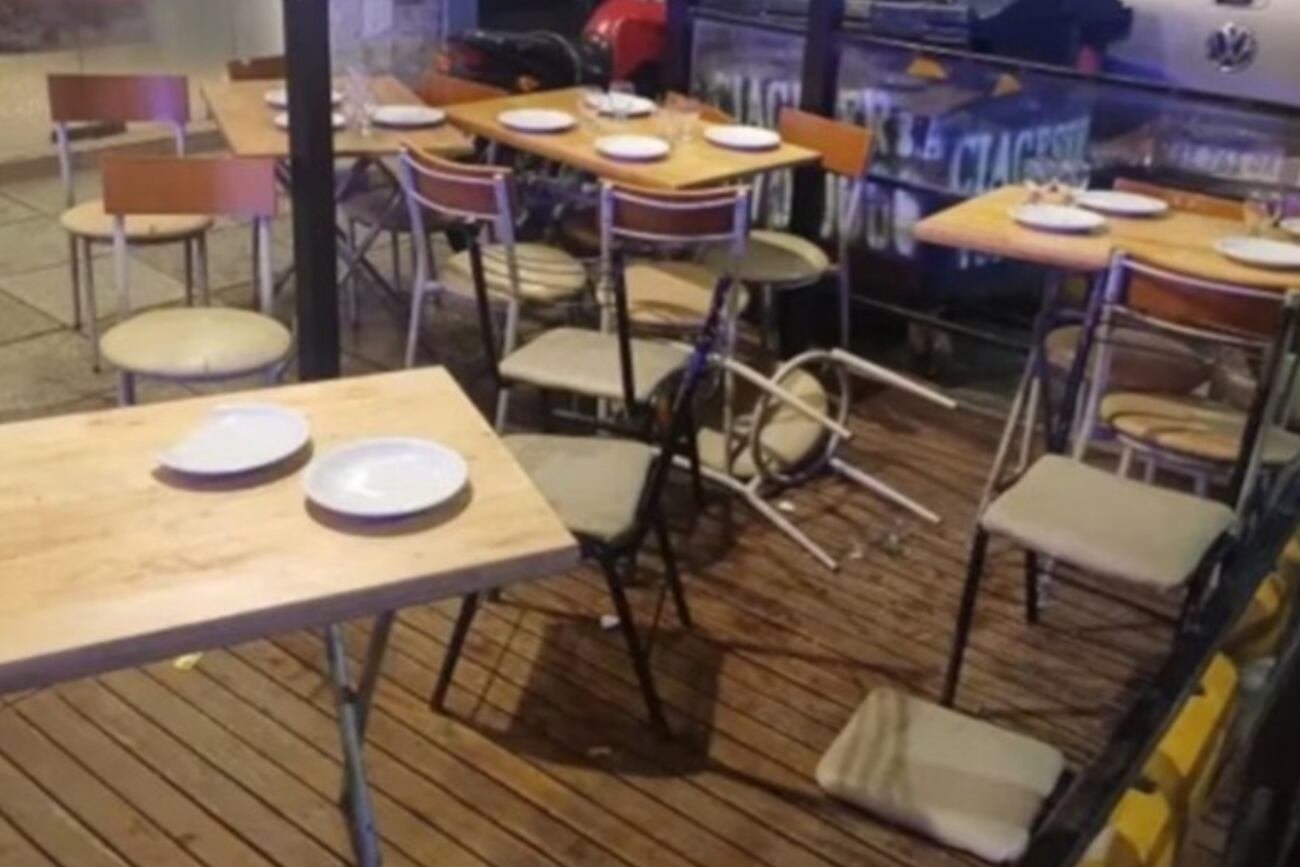 El enfrentamiento dejó el salón en condiciones deplorables: mesas y sillas desparramadas, platos y vasos rotos, botellas por el suelo y cubiertos tirados.