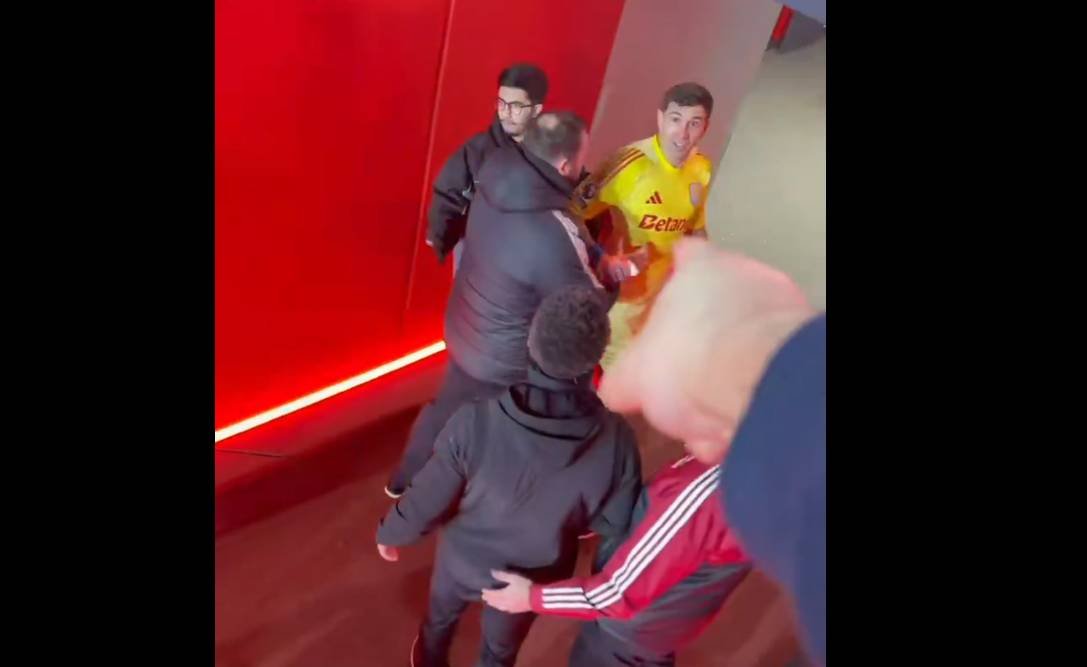 Un video grabado por un simpatizante local captó el momento en el túnel de acceso a los vestuarios del Emirates. Allí se observa cómo Martínez escucha un comentario desde la tribuna, se da vuelta de inmediato y responde, elevando el tono de la discusión. La situación no pasó a mayores gracias a la rápida intervención de un integrante del Personal del Aston Villaque logró contener al arquero marplatense.
