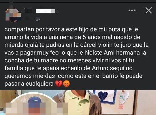 En paralelo al avance de la investigación, el caso tuvo una fuerte repercusión en redes sociales. En Facebook, un presunto familiar de la nena publicó la imagen de uno de los supuestos acusados junto a un mensaje cargado de insultos, amenazas y pedidos de castigo, en el que reclamó justicia y exigió que no vuelva al barrio. La publicación se viralizó rápidamente y generó un clima de stress en la zona. “Compartan por prefer a este hijo de mil puta que le arruinó la vida a una nena de 5 años. Mal nacido de mierda ojalá te pudras en la cárcel, violín te juro que la vas a pagar muy feo”, se lee en el posteo.