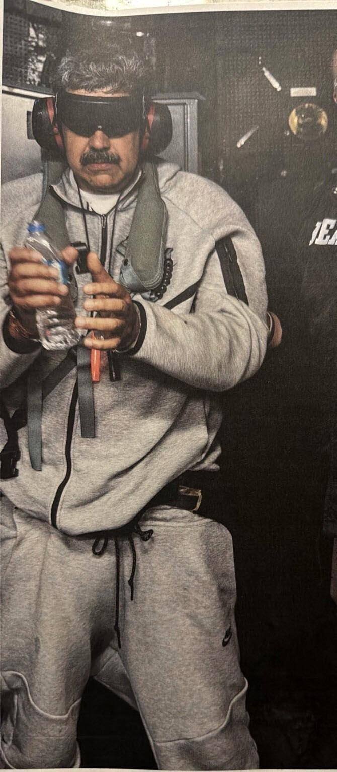 Trump difundió en redes sociales una imagen de Nicolás Maduro esposado, con gafas oscuras, a bordo de un buque militar estadounidense. Según confirmó el propio presidente, el mandatario venezolano fue trasladado a Nueva York para responder ante la Justicia estadounidense por cargos de narcotráfico y terrorismo (ver aparte).
