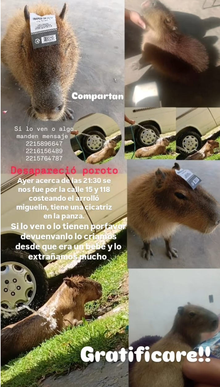 Para incentivar la ayuda, la familia ofreció una recompensa de 500 mil pesos para quien aporte datos certeros que permitan encontrar al carpincho de Punta Lara o facilitar su regreso sano y salvo.