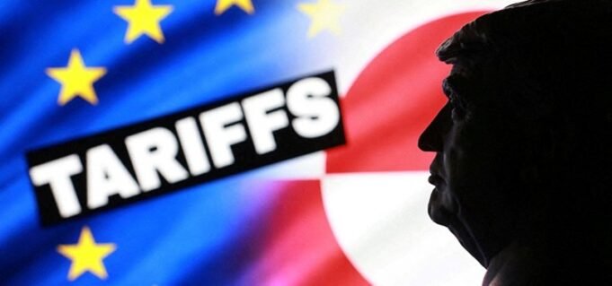 En esta ilustración tomada el 17 de enero de 2026 aparece un modelo en miniatura impreso en 3 D del presidente estadounidense Donald Trump, las banderas de la UE y de Groenlandia, y la palabra “Aranceles”.