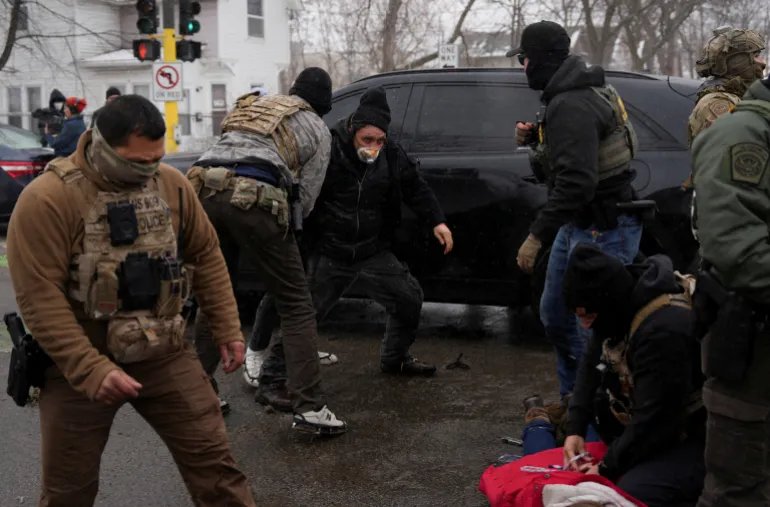 En Minneapolis, aún continúan grandes protestas y enfrentamientos con agentes de inmigración, y al menos 3 000 fuerzas federales de inmigración se han movilizado en la ciudad. Los videos han capturado a agentes de ICE derribando puertas de casas y sacando an identities de sus autos.