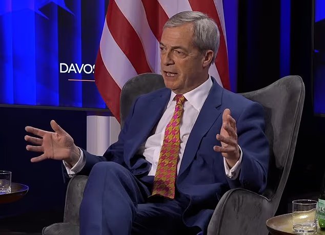“No volveremos a dejarnos dictar por ustedes”, dijo el líder de ReformUK, Nigel Farage, a las élites mundiales en Davos, Suiza (en la foto)