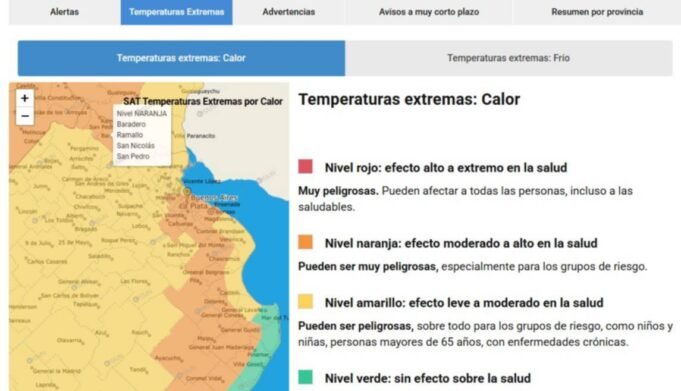 A su vez el SMN renovó el alerta a naranja, lo que implica que el calor extremo puede provocar “efecto moderado a alto en la salud”, según el SMN. Las temperaturas del rango previsto “pueden ser muy peligrosas, especialmente  para los grupos de riesgo”, indicó el organismo.