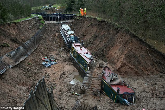 Una sección del canal Llangollen en Whitchurch, Shropshire, se derrumbó el 22 de diciembre, hundiendo dos embarcaciones estrechas en un agujero en el lecho del canal y dejando a una tambaleándose en el borde, mientras que media docena más quedaron varadas.
