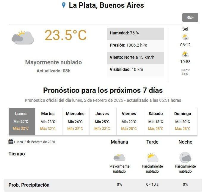 Febrero llegó a La Plata con calor y amenazado por lluvias para esta semana, según el informe del Servicio Meteorológico Nacional (SMN). Tras un domingo sofocante, para este lunes se espera que el termómetro alcance los 32 grados.
