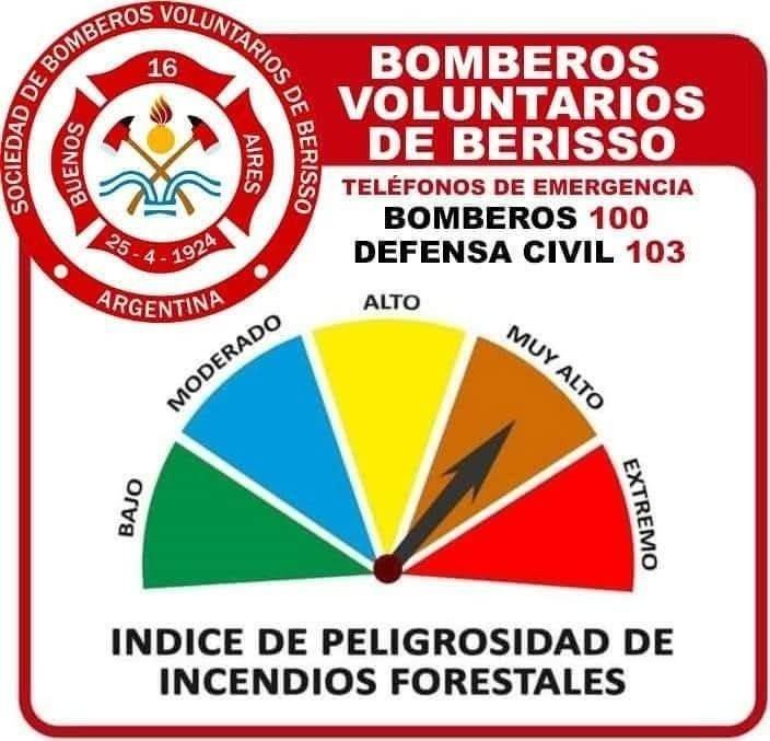 En medio de la ola de calor que viene azotando a nuestra región, los Bomberos Voluntarios de Berisso informaron que el índice de peligrosidad de incendios forestales se encuentra en uno de los niveles más extremos. En un comunicado reciente dieron cuenta de que es “muy alto” el riesgo de focos ígneos.
