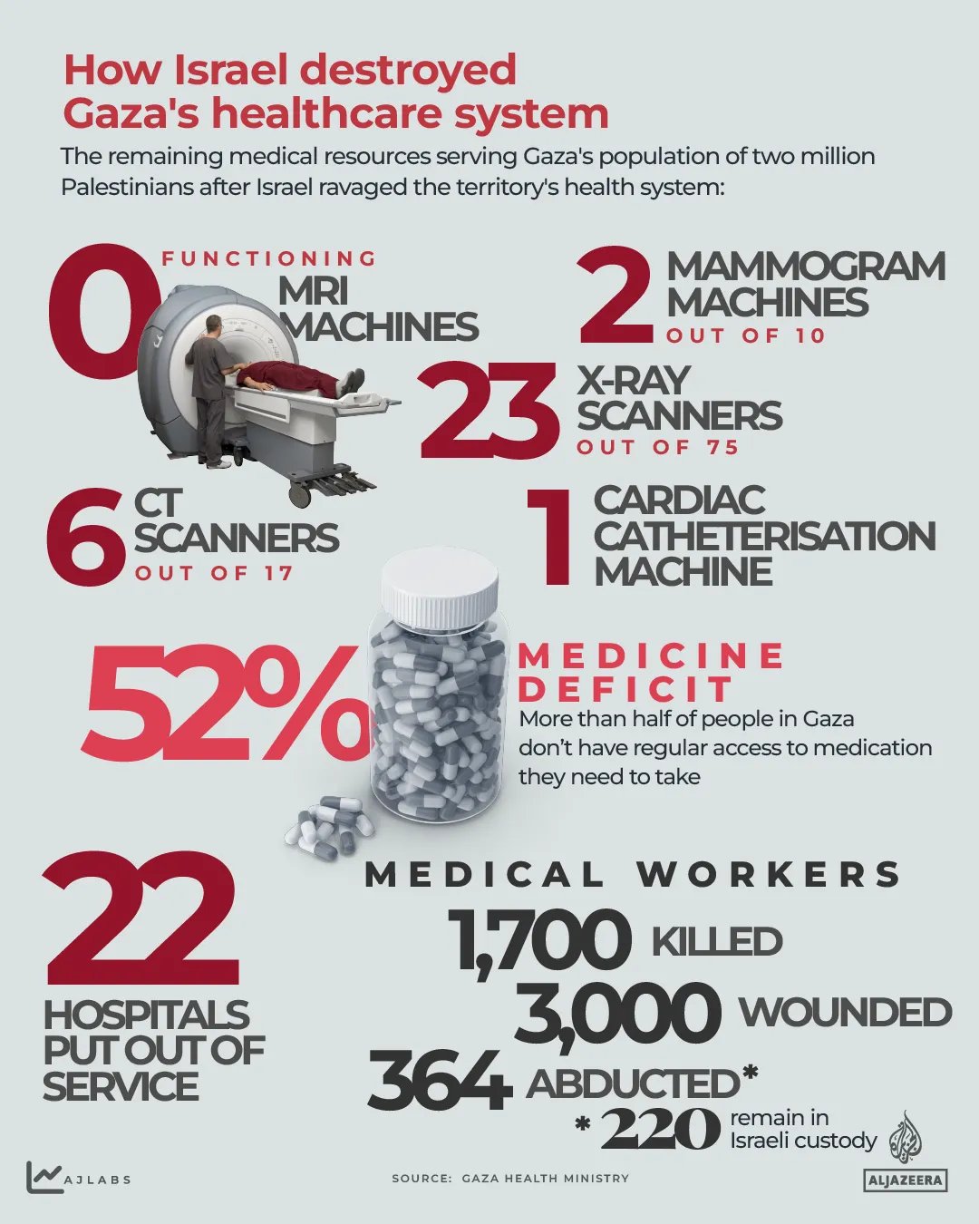 “Los hospitales de Gaza han sido destruidos. Sus médicos y enfermeras han sido asesinados, encarcelados y obligados a huir”, dijo a Al Jazeera.